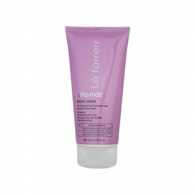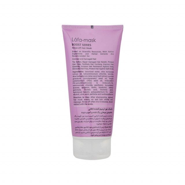 ماسک مو ترمیم کننده لافارر مدل Boost series برای موهای رنگ شده و آسیب دیده مناسب است. این محصول با داشتن عصاره انار و روغن دانه کتان، موجب افزایش درخشندگی رنگ مو ، تثبیت رنگ مو و نرمی مو می شود. ماسک مو لافارر حاوی کراتین هیدرولیز شده است که موهای آسیب دیده را ترمیم کرده و کراتین آنها را بازسازی خواهد کرد. همچنین شانه پذیری مو را آسان کرده و از آن ها در مقابل حرارت سشوار محافظت خواهد کرد. جلوگیری از ایجاد موخوره و وز در مو از دیگر خواص این ماسک مو می باشد.